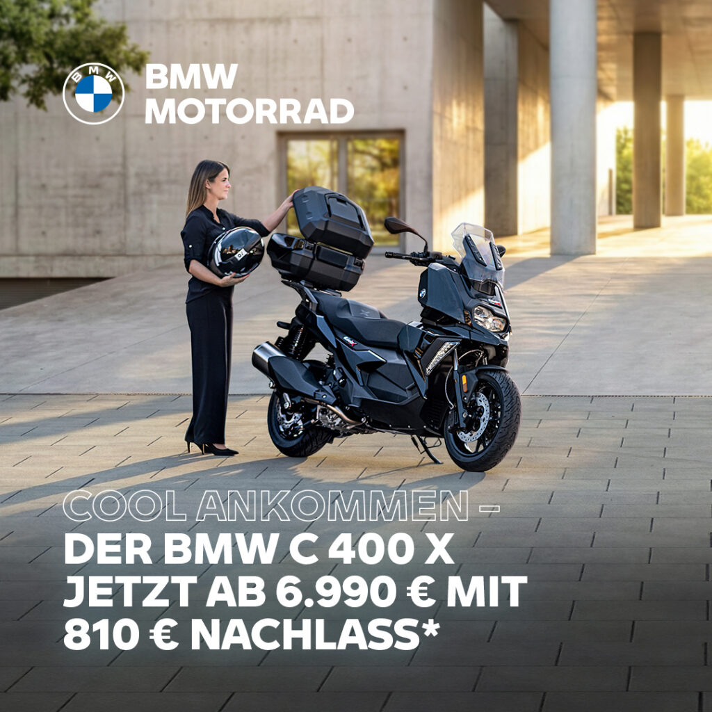 * Das Angebot gilt, solange der Vorrat reicht. Nicht mit anderen Aktionen kombinierbar, zzgl. Überführung und Zulassung. Druckfehler, Irrtümer & Änderungen vorbehalten. Hersteller-Nachlass i.H.v. 810 € bei Barkauf auf die unverbindliche Preisempfehlung (UPE) von BMW Motorrad Deutschland, alle Preise inkl. 19 % MwSt., gültig bei Kauf und Übernahme eines neuen BMW C 400 X bis 30.06.2026 bei teilnehmenden BMW Motorrad Partnern in Deutschland. Deinen finalen Preis inkl. aller Nebenkosten erfährst Du bei Deinem BMW Motorrad Partner.