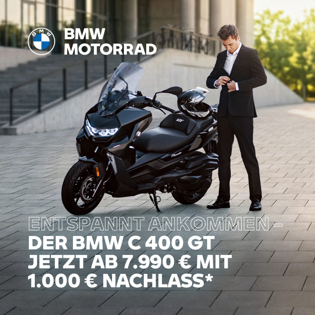 ** Das Angebot gilt, solange der Vorrat reicht. Nicht mit anderen Aktionen kombinierbar, zzgl. Überführung und Zulassung. Druckfehler, Irrtümer & Änderungen vorbehalten. Hersteller-Nachlass i.H.v. 1.000 € bei Barkauf auf die unverbindliche Preisempfehlung (UPE) von BMW Motorrad Deutschland, alle Preise inkl. 19 % MwSt., gültig bei Kauf und Übernahme eines neuen BMW C 400 GT bis 30.06.2026 bei teilnehmenden BMW Motorrad Partnern in Deutschland. Deinen finalen Preis inkl. aller Nebenkosten erfährst Du bei Deinem BMW Motorrad Partner.