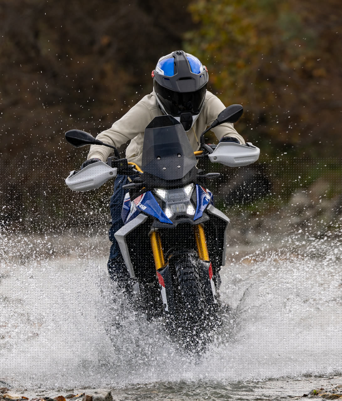 Für maximale Kontrolle sorgen serienmäßige Fahrmodi wie „Rain“, „Road“ und „Enduro“ sowie moderne Assistenzsysteme wie ABS Pro, Dynamic Traction Control und die Motorschleppmomentregelung (MSR). Zusammen mit dem präzisen Fahrwerk aus Upside-down-Gabel und Aluminium-Schwinge entsteht ein ausgewogenes Setup, das sowohl auf Asphalt als auch im Gelände überzeugt.
