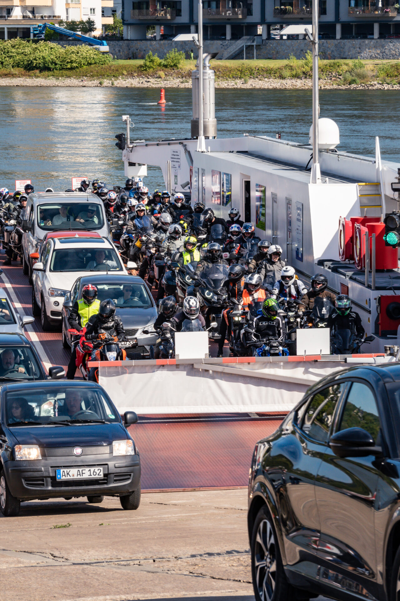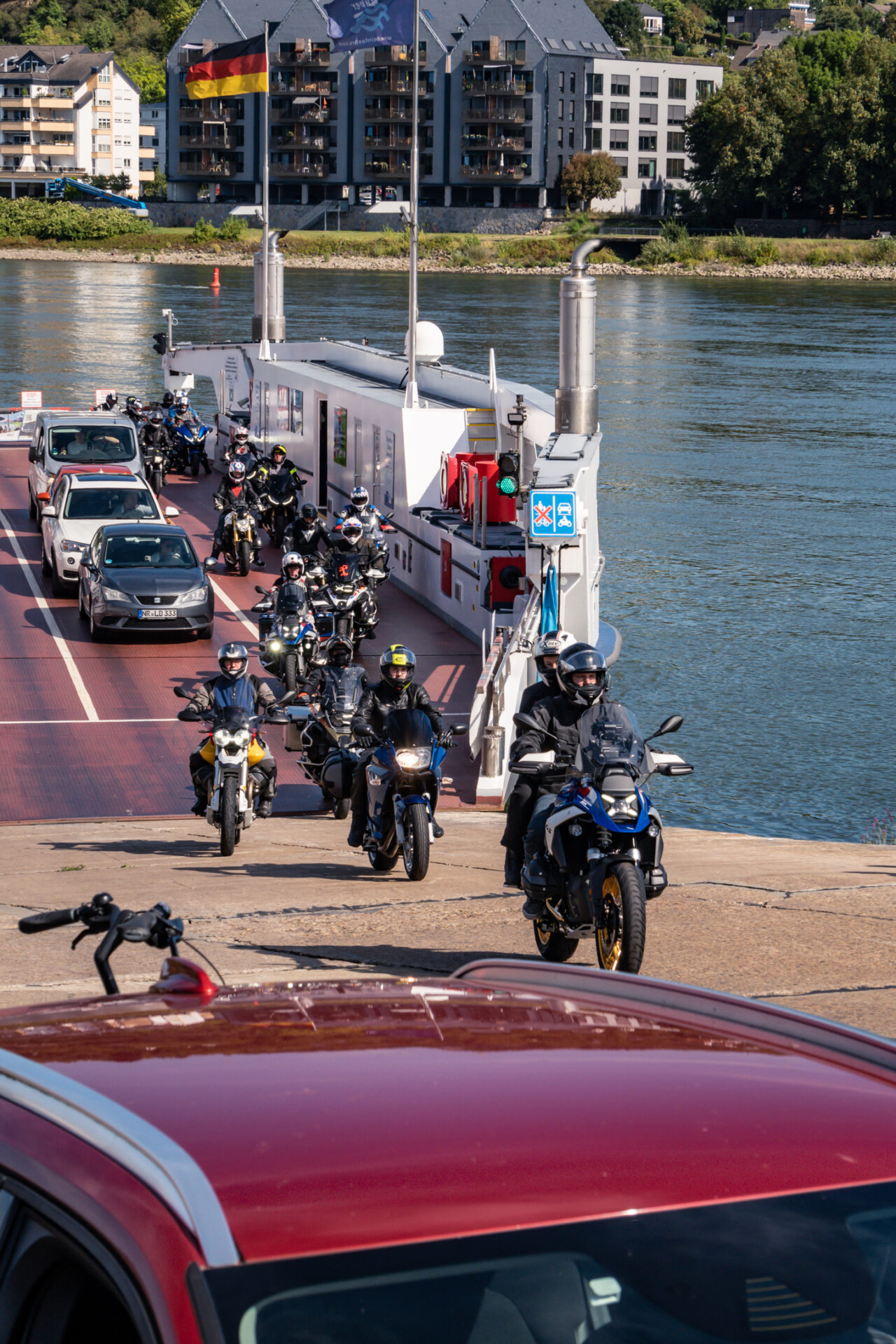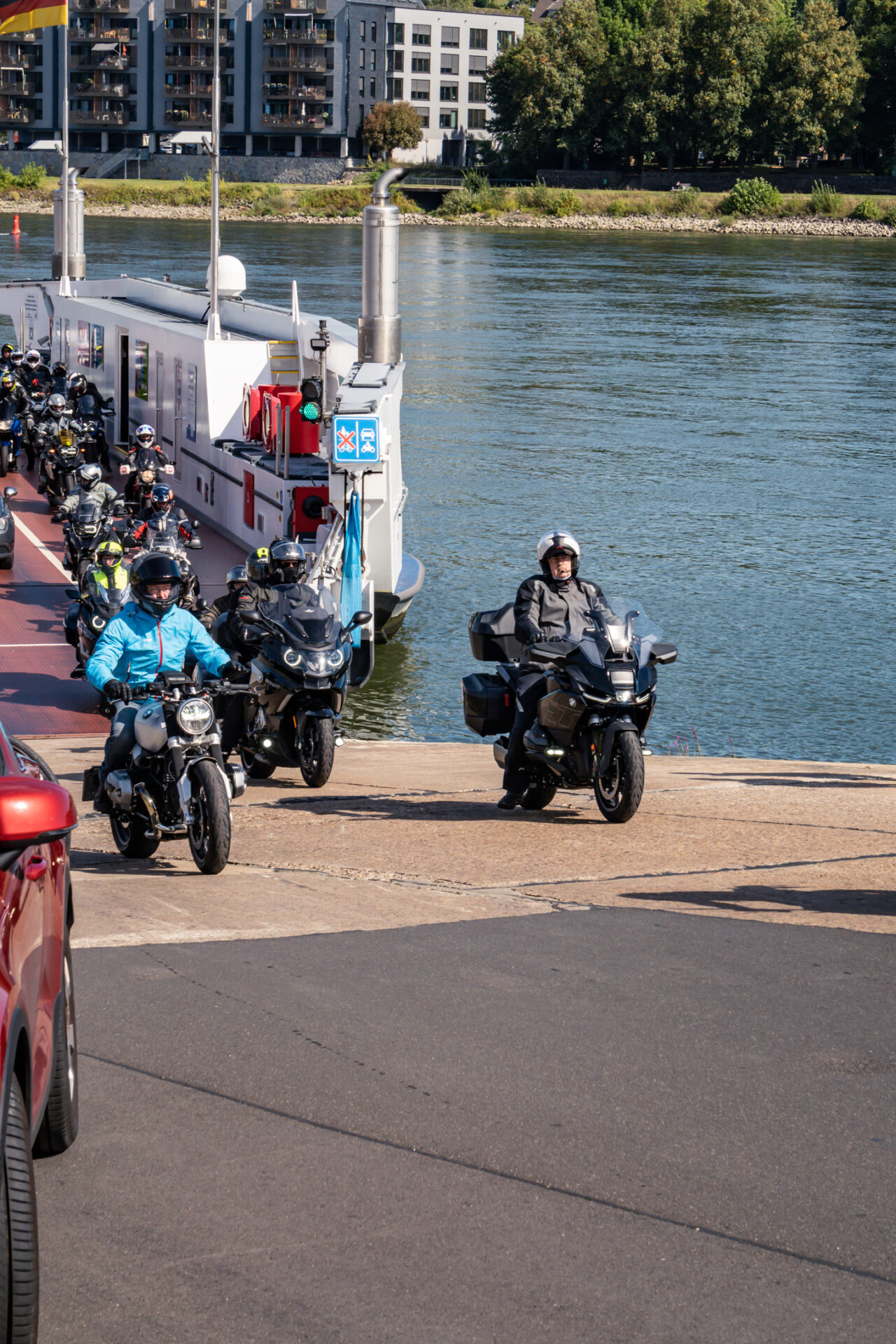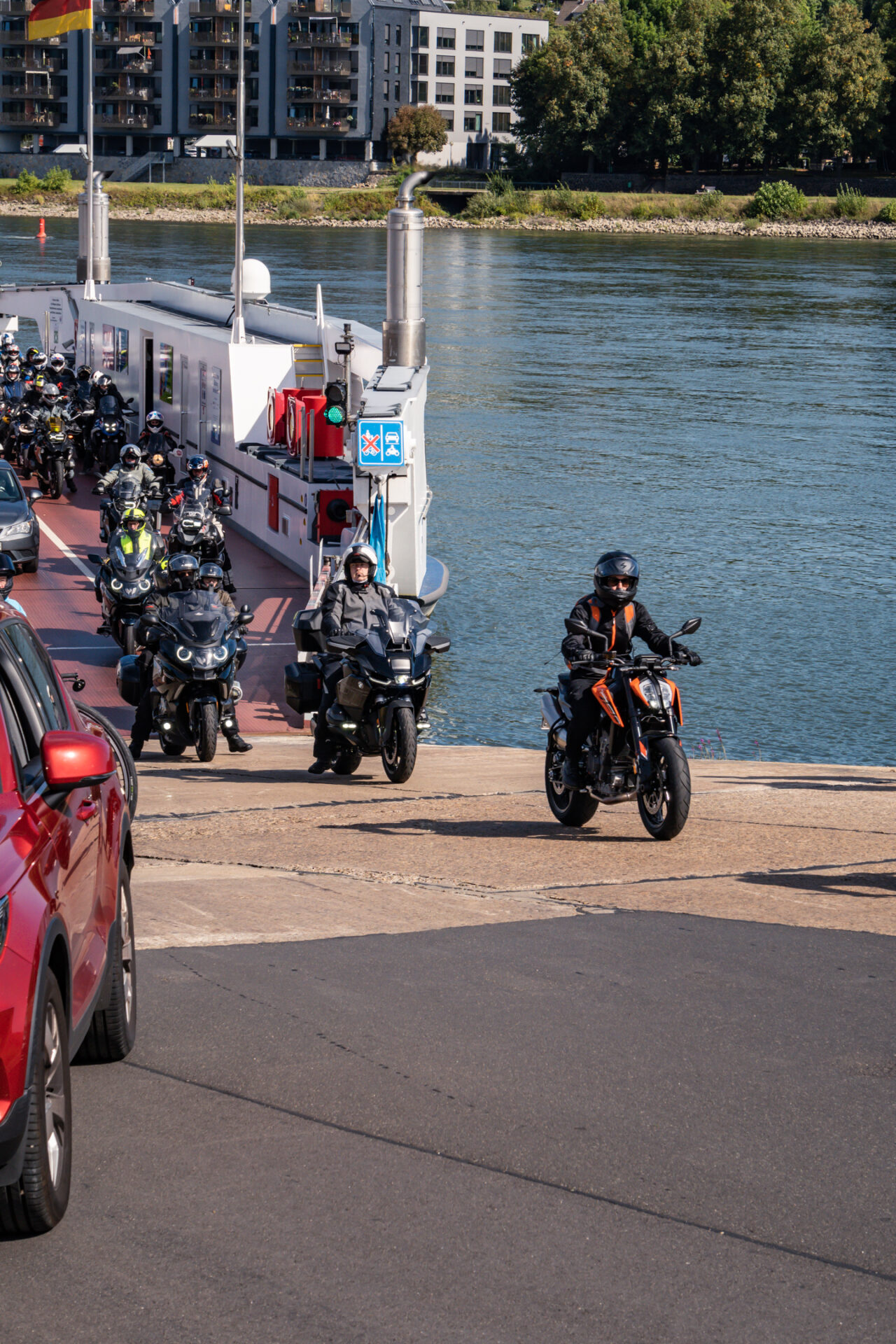 Von Overath, Werdohl und Wipperfürth aus ging es nach einem gemeinsamen Frühstück in geführten Gruppen auf die individuell gestalteten Routen. Jeder konnte sein Tempo wählen – von gemütlich bis sportlich. Über kurvige Landstraßen, durch eindrucksvolle Täler und entlang von Flüssen führte der Weg Richtung Rhein. Ein echtes Highlight: die Überfahrt mit der Fähre, bei der unsere große Biker-Gruppe alle Blicke auf sich zog.