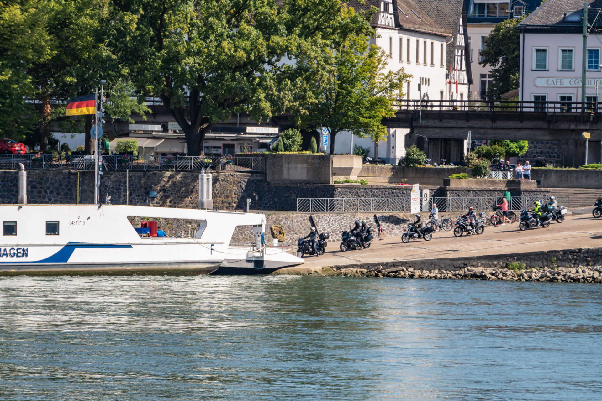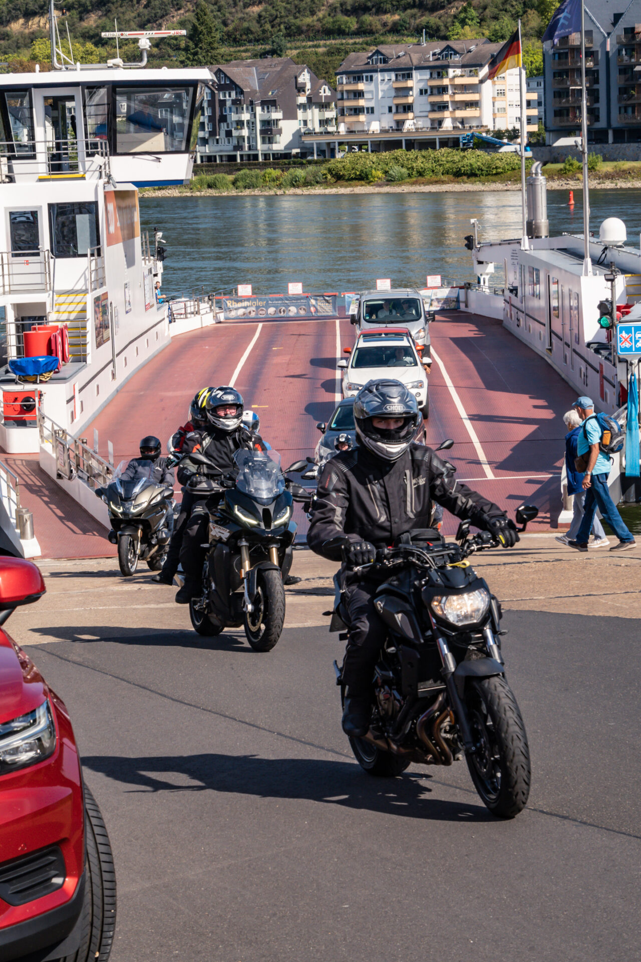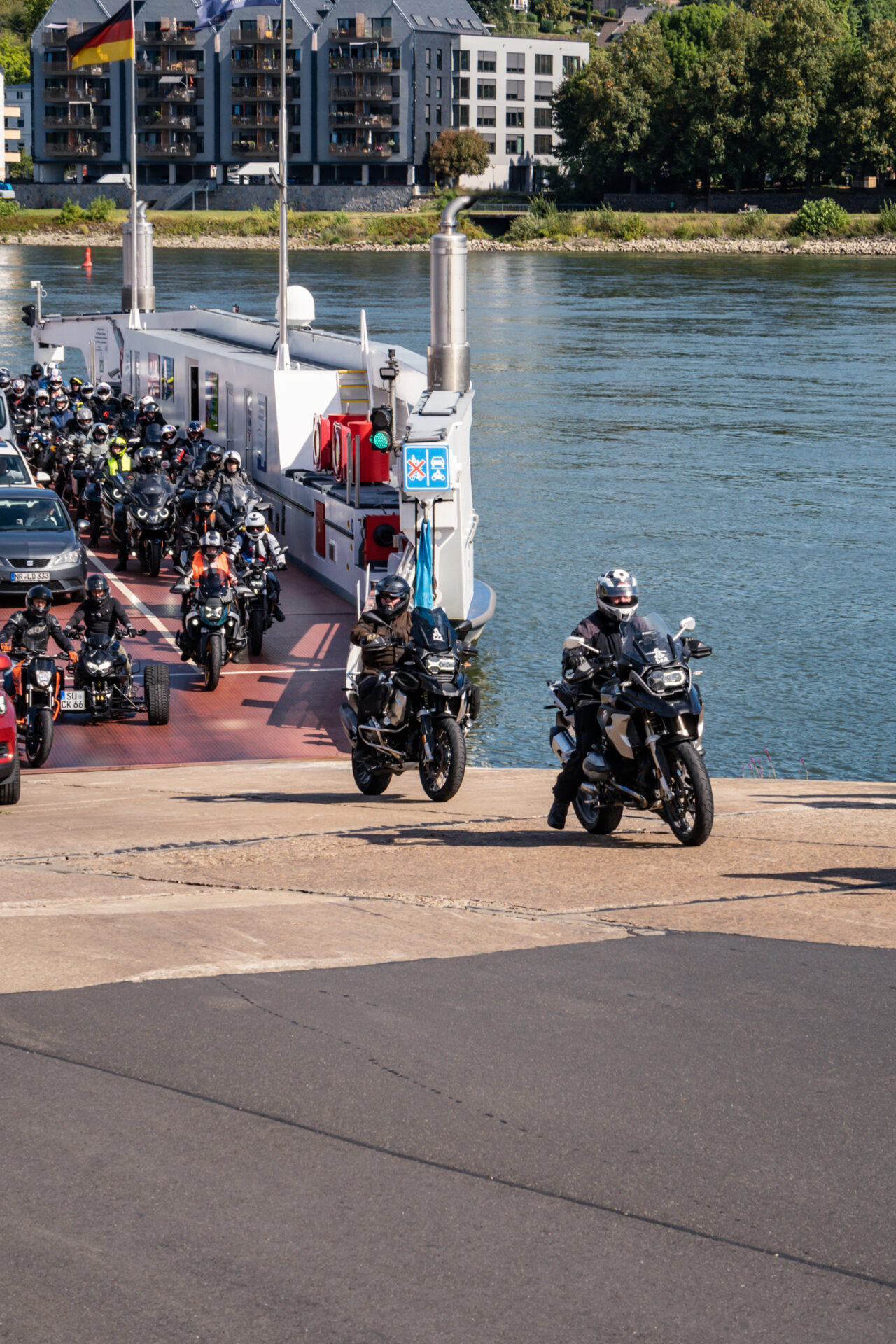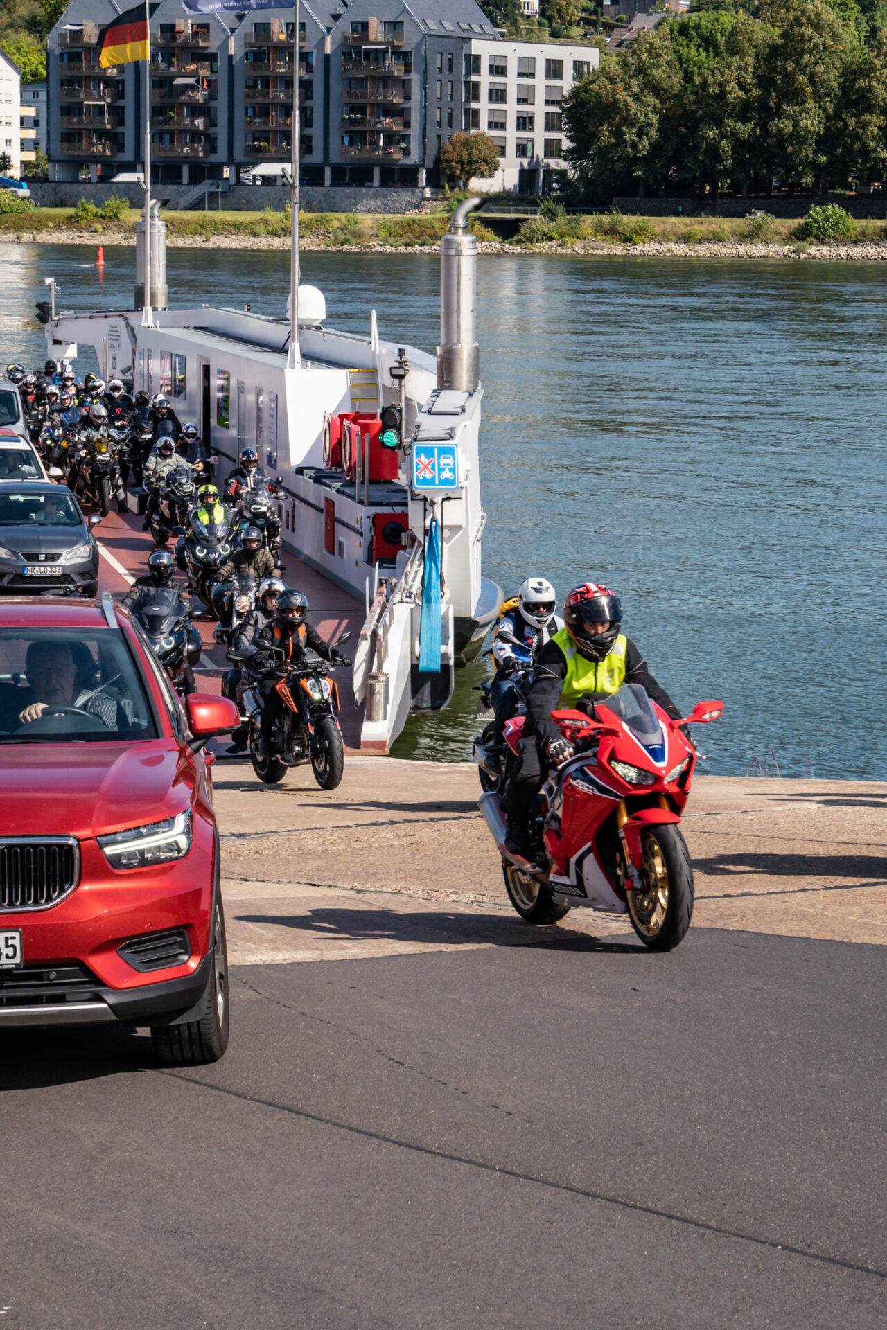 Von Overath, Werdohl und Wipperfürth aus ging es nach einem gemeinsamen Frühstück in geführten Gruppen auf die individuell gestalteten Routen. Jeder konnte sein Tempo wählen – von gemütlich bis sportlich. Über kurvige Landstraßen, durch eindrucksvolle Täler und entlang von Flüssen führte der Weg Richtung Rhein. Ein echtes Highlight: die Überfahrt mit der Fähre, bei der unsere große Biker-Gruppe alle Blicke auf sich zog.